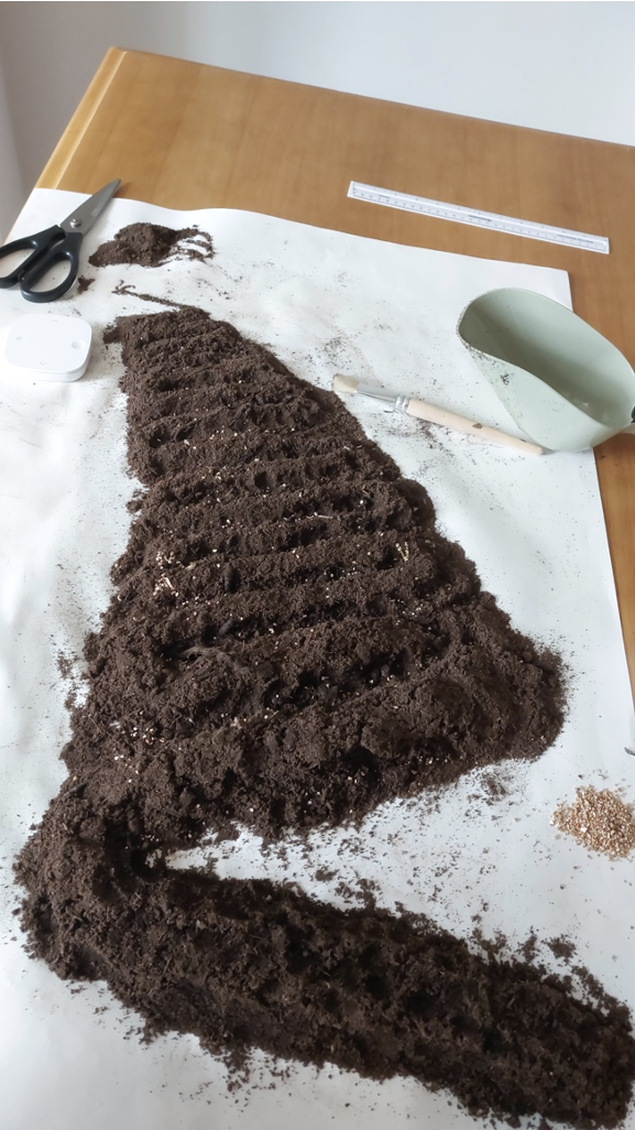 Every year in the Trinity Long Room Hub, its Early Career Researchers make a poster related to our respective dissertations for public engagement. Seeing that I study the Georgics, my idea was to convey the relationship between farming and poetry that Virgil explored, and I chose the ploughing-writing metaphor as a way to represent it. Having a clear mental image of what it should look like, I found no reason not to use dirt and clay to make the poster, or rather an installation, with my own hands; in my motivation to do so, there was also a weighty factor of me finding no way to digitally design what I intended. This was the earliest stage of a ploughed field (Fig. 3 below).
